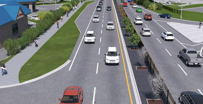 Work also includes building a continuous landscaped median and permanently closing all remaining left‑turn bays to support safer pedestrian movement and more predictable traffic flow.